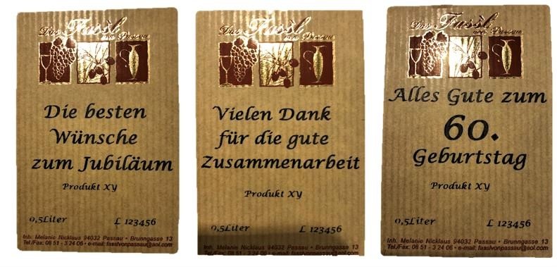 Sie haben in unserem Sortiment schon das passende gefunden? Dann verpacken wir Ihr Geschenk natürlich. Auch eine individuelle Beschriftung der Flaschen ist möglich. Bitte einfach im Kommentarfeld Ihren persönlichen Text eintragen.